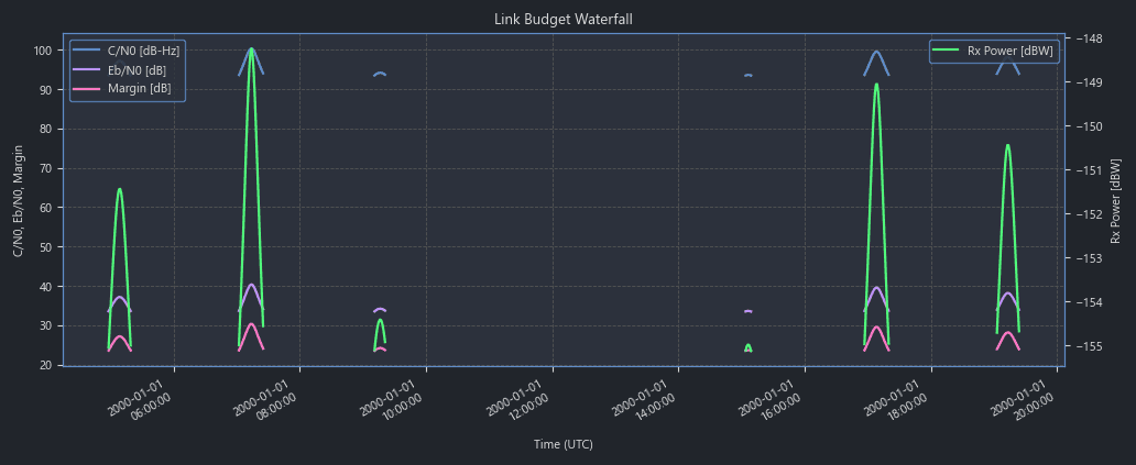 By introducing simplified transmitter and receiver models, contact analysis can be extended into link budget evaluation. This makes it possible to estimate whether a communication link is feasible during each access window and to evaluate metrics such as link margin.