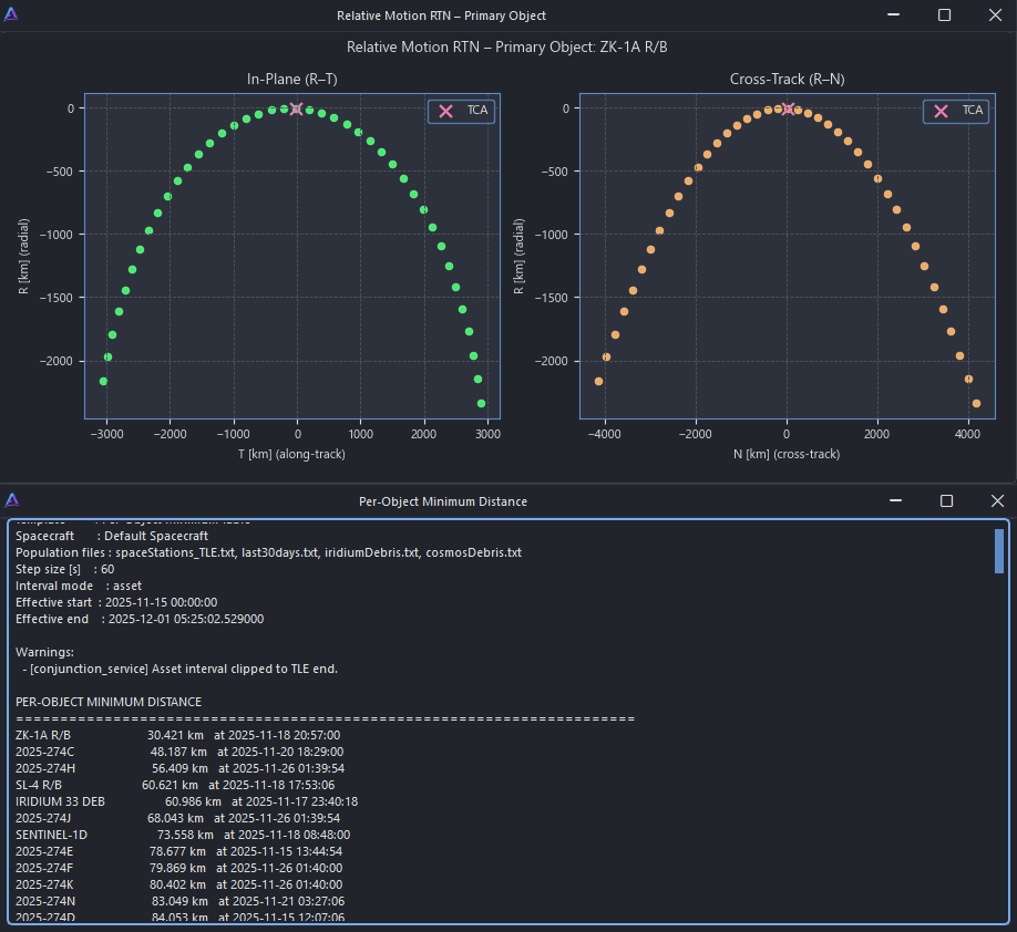 For each candidate event, the analysis determines the Time of Closest Approach (TCA) — the instant at which the relative distance between two objects is minimised. This provides the temporal anchor for all subsequent risk evaluation.