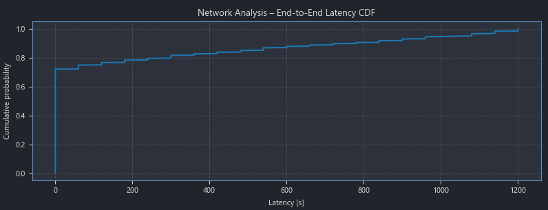 Time-resolved analysis of inter-satellite connectivity and message delivery performance.