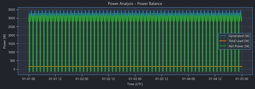 Time-dependent power balance including static and event-driven loads during eclipse, sunlight, and operational duty cycles.
