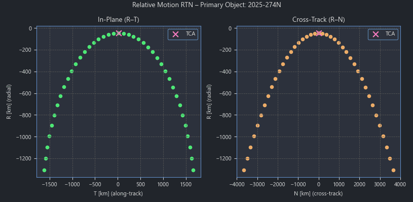 Precise computation of relative geometry, miss distance, and encounter parameters.